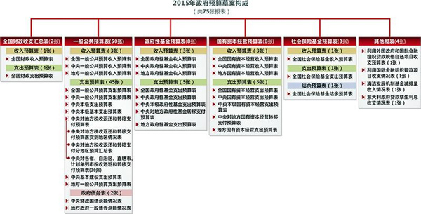 下面以2015年为例,简要介绍预算草案的结构。国务院提交全国人大审查的2015年政府预算草案中一共有报表75张。